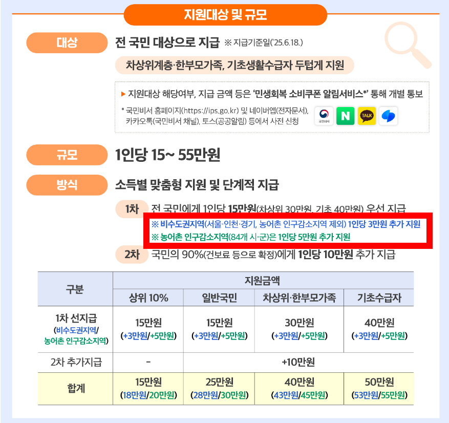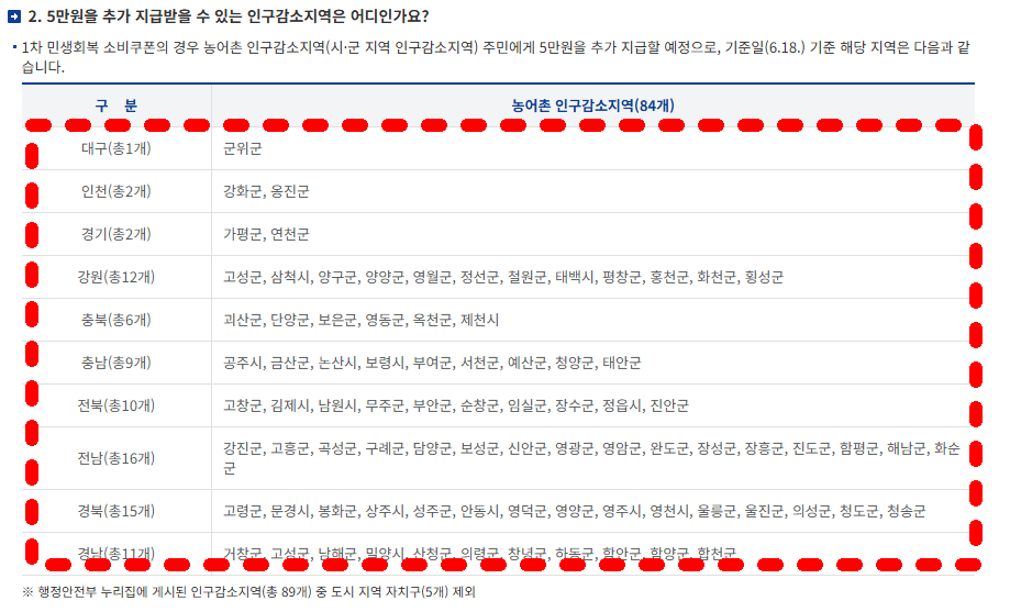 | 지원금 5만원 추가 | 전국 지급 X | 84개 지역만 해당 |
