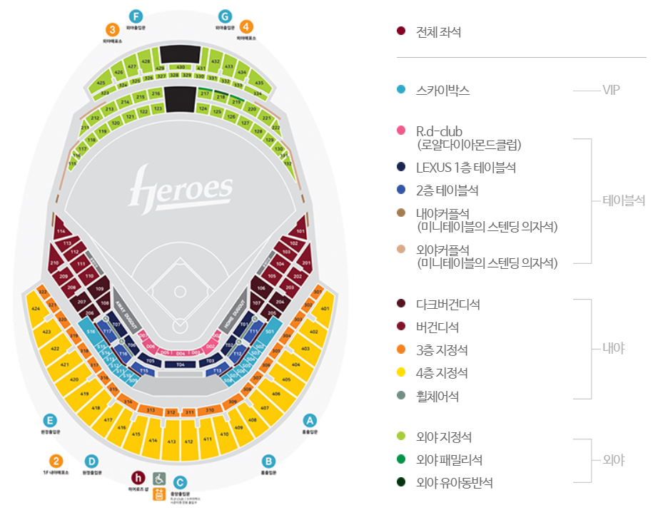 | 중앙 내야 상단 | 전체 파노라마 가능 | 시야 가림 요소 주의 |