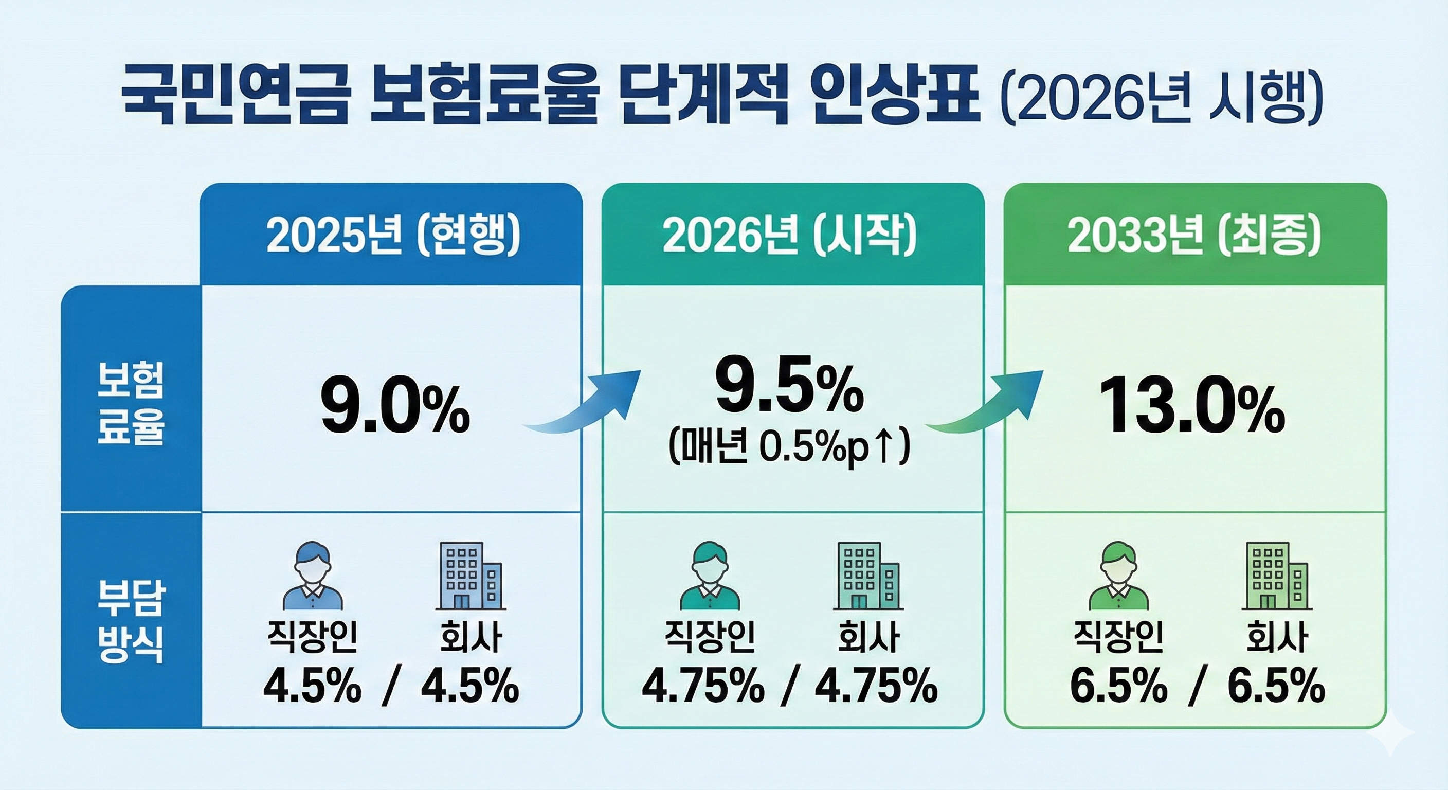 가장 먼저 피부에 와닿는 변화는 매달 내는 보험료 인상입니다. 지금까지 우리는 월급의 9%를 내왔지만, 2026년부터는 **9.5%**로 인상됩니다.